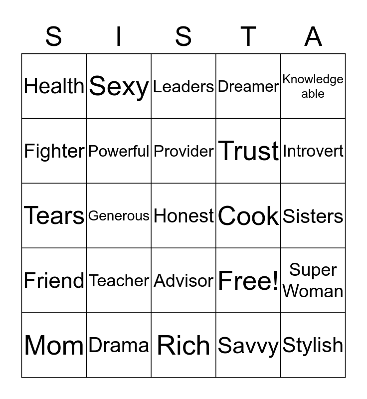 This bingo card has 25 words: Teacher, Rich, Provider, Mom, Knowledge able, Health, Fighter, Sexy, Cook, Advisor, Trust, Tears, Free!, Super Woman, Powerful, Stylish, Sisters, Leaders, Introvert, Generous, Honest, Drama, Friend, Dreamer and Savvy.