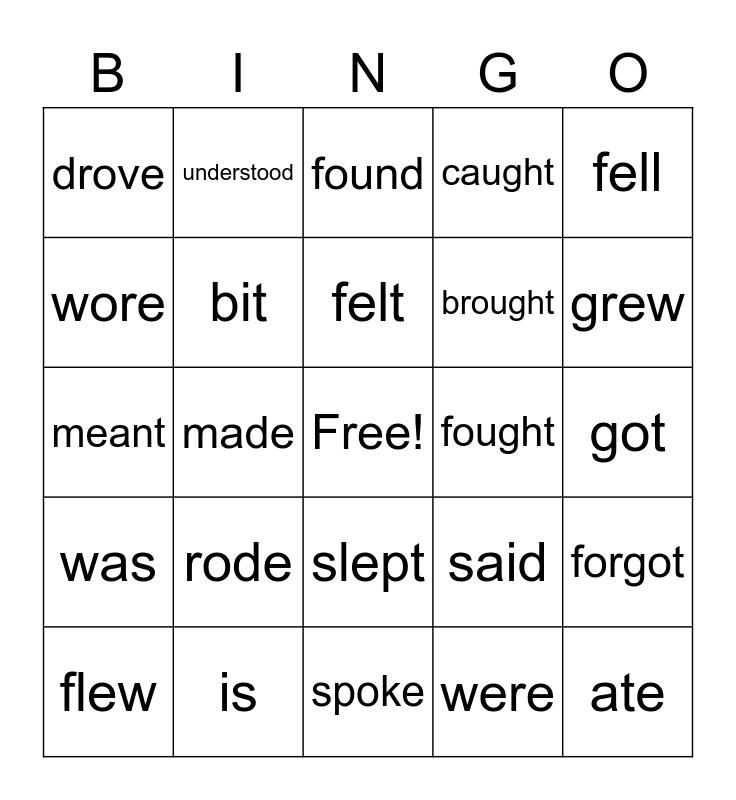 This bingo card has a free space and 58 words: am, is, are, was, were, became, bit, broke, brought, bought, caught, chose, came, did, drank, drove, ate, fell, fed, felt, fought, found, flew, forgot, forgave, got, gave, went, grew, had, heard, hid, hit, kept, knew, left, lost, made, meant, paid, rode, ran, said, saw, sent, sank, sat, slept, spoke, spent, stood, took, taught, thought, understood, woke, wore and wrote.