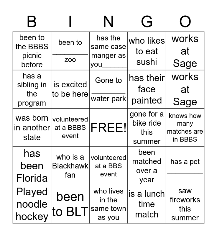 This bingo card has a free space and 24 words: who is a Blackhawk fan, been to BLT, Gone to ________ water park, Played noodle hockey, works at Sage, been to the BBBS picnic before, has a sibling in the program, been to _________ zoo, gone for a bike ride this summer, volunteered at a BBS event, has their face painted, was born in another state, been matched over a year, has a pet _________, is excited to be here, is a lunch time match, knows how many matches are in BBBS, has the same case manger as you______, works at Sage, volunteered at a BBBS event, saw fireworks this summer, has been Florida, who likes to eat sushi and who lives in the same town as you.