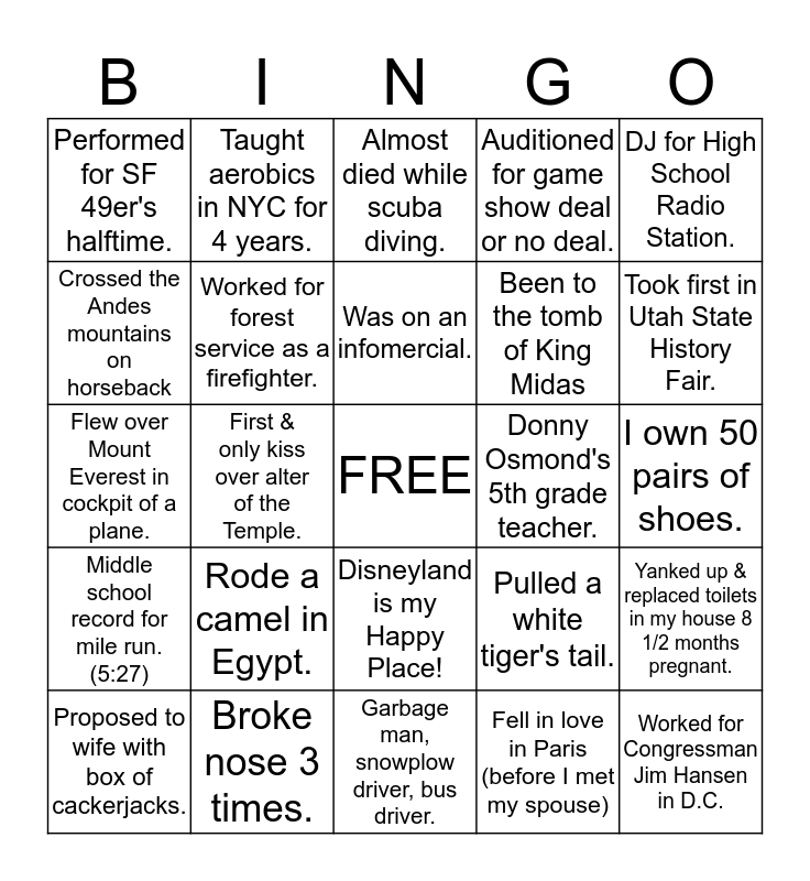 This bingo card has a free space and 24 words: Rode a camel in Egypt., Broke nose 3 times., Was on an infomercial., Proposed to wife with box of cackerjacks., DJ for High School Radio Station., Performed for SF 49er's halftime., Crossed the Andes mountains on horseback, Taught aerobics in NYC for 4 years., Donny Osmond's 5th grade teacher., Disneyland is my Happy Place!, Been to the tomb of King Midas, Flew over Mount Everest in cockpit of a plane., Pulled a white tiger's tail., Yanked up & replaced toilets in my house 8 1/2 months pregnant., Worked for forest service as a firefighter., Fell in love in Paris (before I met my spouse), I own 50 pairs of shoes., Almost died while scuba diving., Took first in Utah State History Fair., First & only kiss over alter of the Temple., Worked for Congressman Jim Hansen in D.C., Middle school record for mile run. (5:27), Auditioned for game show deal or no deal. and Garbage man, snowplow driver, bus driver..
