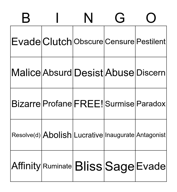 This bingo card has a free space and 24 words: Abolish, Ruminate, Desist, Affinity, Pestilent, Evade, Malice, Clutch, Surmise, Lucrative, Abuse, Bizarre, Inaugurate, Antagonist, Absurd, Sage, Paradox, Obscure, Discern, Profane, Evade, Resolve(d), Censure and Bliss.