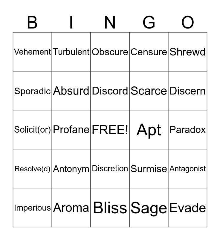 This bingo card has a free space and 24 words: Antonym, Aroma, Discord, Imperious, Shrewd, Vehement, Sporadic, Turbulent, Apt, Discretion, Scarce, Solicit(or), Surmise, Antagonist, Absurd, Sage, Paradox, Obscure, Discern, Profane, Evade, Resolve(d), Censure and Bliss.