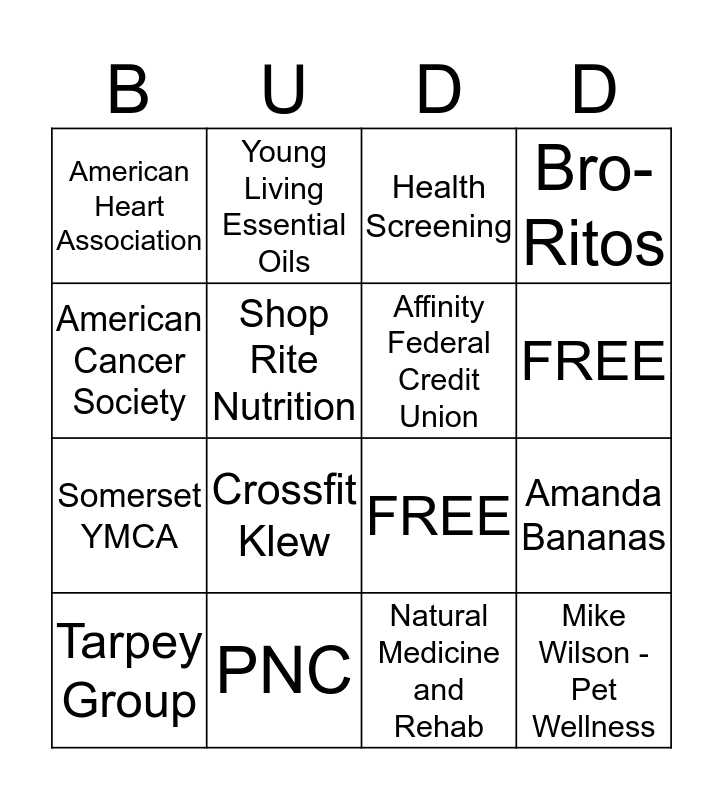 This bingo card has 16 words: PNC, Amanda Bananas, Health Screening, American Heart Association, Somerset YMCA, Young Living Essential Oils, FREE, Natural Medicine and Rehab, American Cancer Society, Shop Rite Nutrition, Tarpey Group, Bro-Ritos, Crossfit Klew, FREE, Affinity Federal Credit Union and Mike Wilson - Pet Wellness.