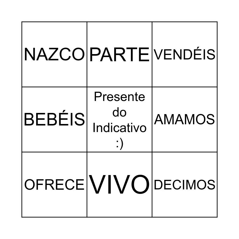 This bingo card has a free space and 8 words: AMAMOS, VENDÉIS, PARTE, OFRECE, NAZCO, DECIMOS, BEBÉIS and VIVO.