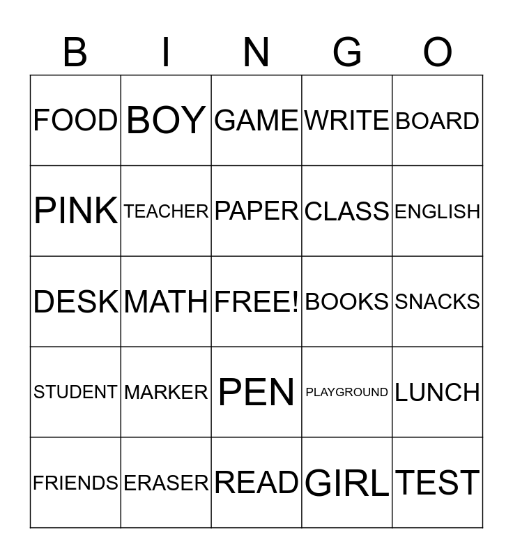 This bingo card has a free space and 24 words: MARKER, ERASER, PAPER, FRIENDS, BOARD, FOOD, PINK, BOY, BOOKS, PEN, CLASS, DESK, PLAYGROUND, LUNCH, TEACHER, GIRL, SNACKS, GAME, ENGLISH, MATH, TEST, STUDENT, WRITE and READ.