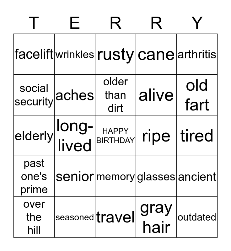 This bingo card has a free space and 24 words: senior, seasoned, older than dirt, over the hill, arthritis, facelift, social security, wrinkles, ripe, memory, alive, elderly, glasses, ancient, aches, gray hair, tired, rusty, old fart, long-lived, outdated, past one's prime, cane and travel.