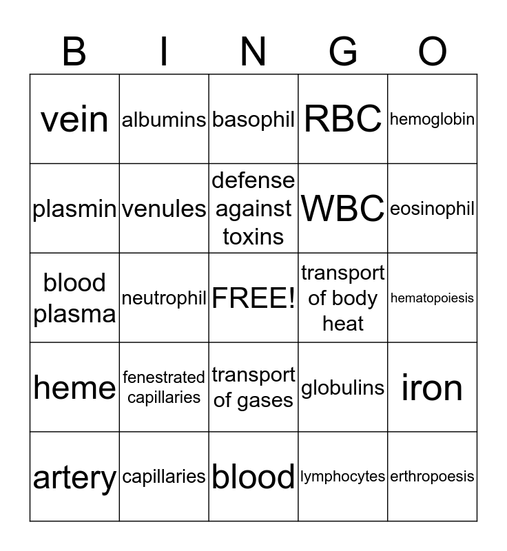 This bingo card has a free space and 24 words: fenestrated capillaries, capillaries, defense against toxins, artery, hemoglobin, vein, plasmin, albumins, transport of body heat, transport of gases, WBC, blood plasma, globulins, iron, venules, lymphocytes, hematopoiesis, basophil, eosinophil, neutrophil, erthropoesis, heme, RBC and blood.