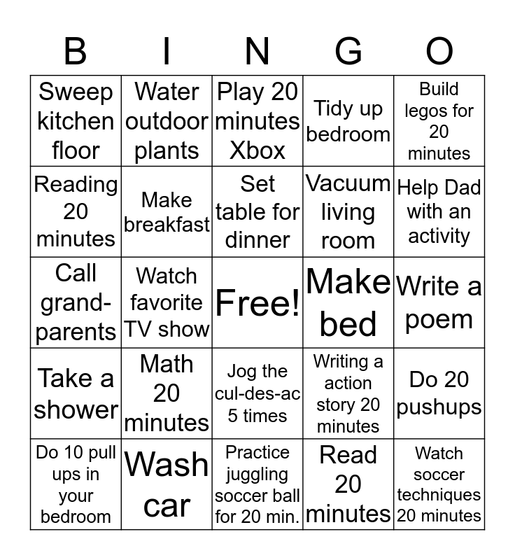 This bingo card has a free space and 24 words: Math 20 minutes, Wash car, Set table for dinner, Do 10 pull ups in your bedroom, Build legos for 20 minutes, Sweep kitchen floor, Reading 20 minutes, Water outdoor plants, Make bed, Jog the cul-des-ac 5 times, Vacuum living room, Call grand- parents, Writing a action story 20 minutes, Do 20 pushups, Make breakfast, Read 20 minutes, Write a poem, Play 20 minutes Xbox, Help Dad with an activity, Watch favorite TV show, Watch soccer techniques 20 minutes, Take a shower, Tidy up bedroom and Practice juggling soccer ball for 20 min..