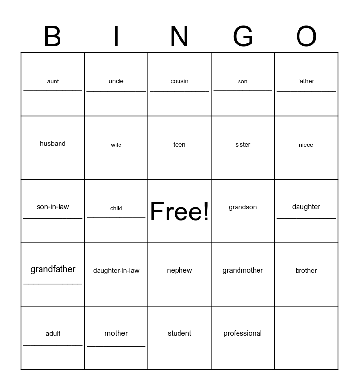 This bingo card has a free space and 24 words: grandfather ____________, mother ______________, nephew _______________, grandmother _______________, father _________________, aunt __________________, uncle _________________, cousin _________________, sister _________________, brother ________________, husband ________________, wife __________________, granddaughter ____________, grandson ________________, niece __________________, adult ________________, child __________________, teen _________________, son __________________, daughter _______________, son-in-law _______________, daughter-in-law ________________, student _______________ and professional _______________.