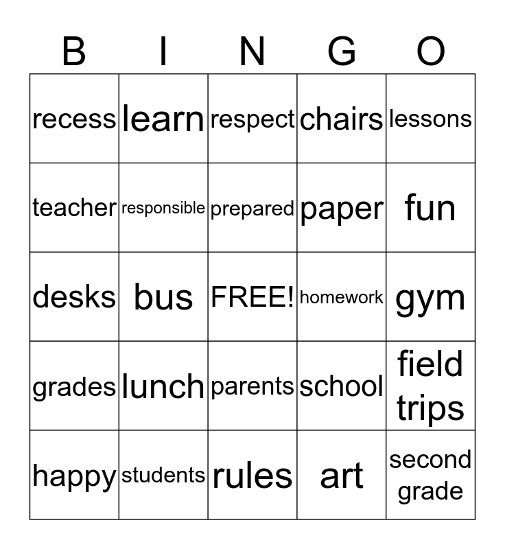 This bingo card has a free space and 27 words: school, pencils, paper, rules, teacher, respect, learn, grades, homework, field trips, desks, chairs, happy, students, fun, friends, responsible, prepared, lunch, recess, gym, art, bus, second grade, parents, lessons and tests.