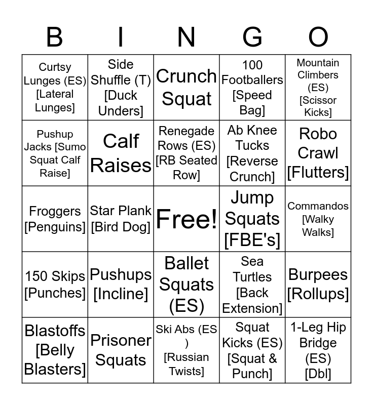 This bingo card has a free space and 24 words: Pushups [Incline], Prisoner Squats, Renegade Rows (ES) [RB Seated Row], Blastoffs [Belly Blasters], Mountain Climbers (ES) [Scissor Kicks], Curtsy Lunges (ES) [Lateral Lunges], Pushup Jacks [Sumo Squat Calf Raise], Side Shuffle (T) [Duck Unders], Jump Squats [FBE's], Ballet Squats (ES), Ab Knee Tucks [Reverse Crunch], Froggers [Penguins], Sea Turtles [Back Extension], Burpees [Rollups], Calf Raises, Squat Kicks (ES) [Squat & Punch], Commandos [Walky Walks], Crunch Squat, Robo Crawl [Flutters], Star Plank [Bird Dog], 1-Leg Hip Bridge (ES) [Dbl], 150 Skips [Punches], 100 Footballers [Speed Bag] and Ski Abs (ES ) [Russian Twists].