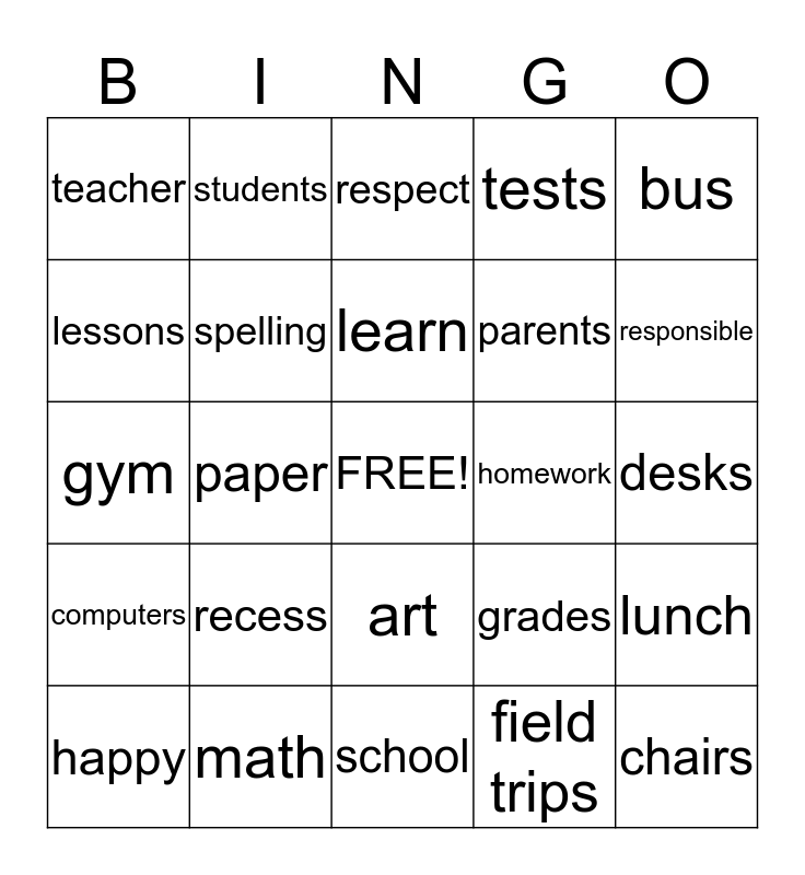 This bingo card has a free space and 31 words: school, pencils, paper, rules, teacher, respect, spelling, grades, homework, field trips, desks, chairs, reading, friends, responsible, prepared, lunch, recess, computers, art, bus, second grade, happy, students, parents, lessons, tests, gym, math, learn and writing.