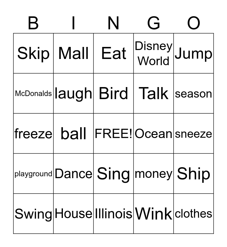 This bingo card has a free space and 24 words: Dance, House, Bird, Swing, Jump, Skip, McDonalds, Mall, Ocean, Sing, Talk, freeze, money, Ship, laugh, Wink, sneeze, Eat, season, ball, clothes, playground, Disney World and Illinois.