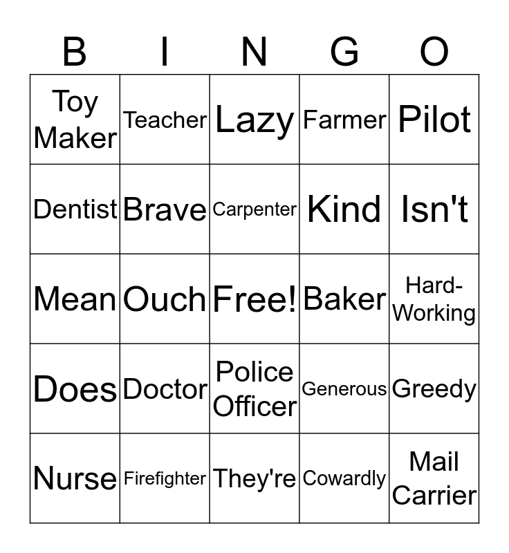 This bingo card has a free space and 24 words: Doctor, Firefighter, Carpenter, Nurse, Pilot, Toy Maker, Dentist, Teacher, Baker, Police Officer, Kind, Mean, Generous, Greedy, Brave, Cowardly, Hard-Working, Lazy, Isn't, Ouch, Mail Carrier, Does, Farmer and They're.