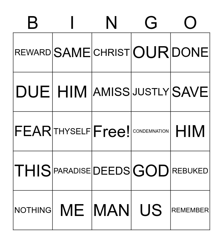 This bingo card has a free space and 24 words: PARADISE, ME, AMISS, NOTHING, DONE, REWARD, DUE, SAME, CONDEMNATION, DEEDS, JUSTLY, FEAR, GOD, REBUKED, HIM, US, HIM, CHRIST, SAVE, THYSELF, REMEMBER, THIS, OUR and MAN.