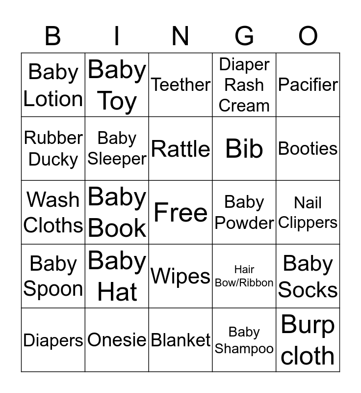 This bingo card has a free space and 24 words: Baby Hat, Onesie, Rattle, Diapers, Pacifier, Baby Lotion, Rubber Ducky, Baby Toy, Baby Powder, Wipes, Bib, Wash Cloths, Hair Bow/Ribbon, Baby Socks, Baby Sleeper, Baby Shampoo, Nail Clippers, Teether, Booties, Baby Book, Burp cloth, Baby Spoon, Diaper Rash Cream and Blanket.