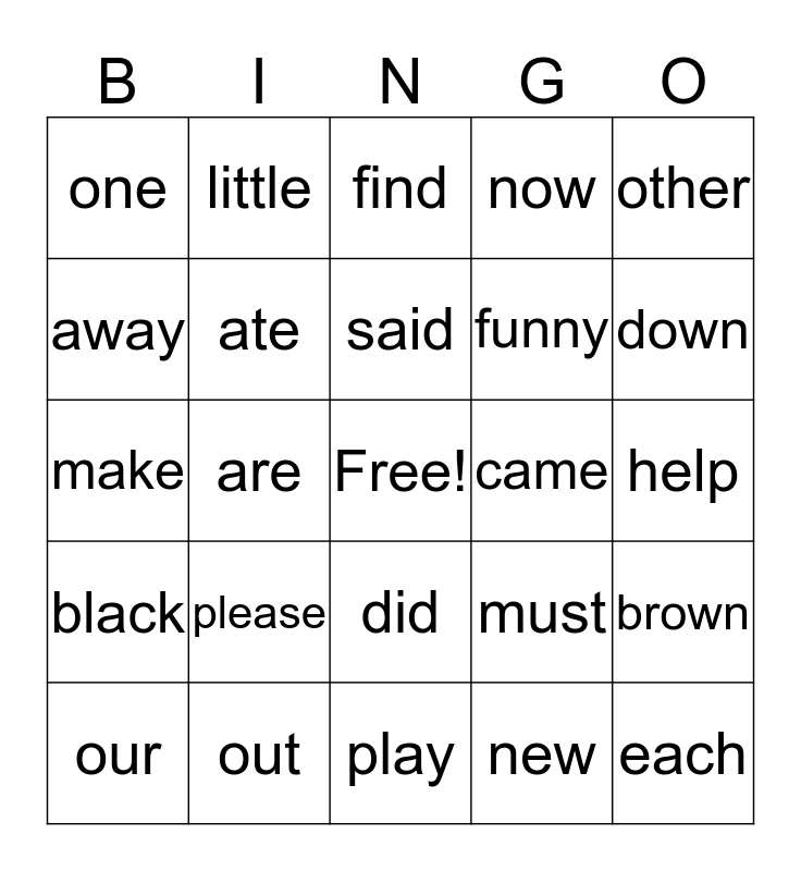 This bingo card has a free space and 24 words: please, out, said, our, other, one, away, little, came, did, funny, make, must, brown, ate, new, help, find, down, are, each, black, now and play.