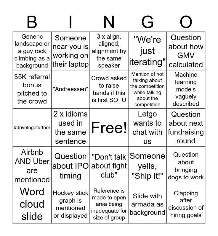 This bingo card has a free space and 24 words: Question about IPO timing, Hockey stick graph is mentioned or displayed, Crowd asked to raise hands if this is first SOTU, Word cloud slide, Question about how GMV calculated, Generic landscape or a guy rock climbing as a background, $5K referral bonus pitched to the crowd, Someone near you is working on their laptop, Letgo wants to chat with us, "Don't talk about fight club", Mention of not talking about the competition while talking about the competition, #drivetogofurther, Someone yells, "Ship it!", Question about bringing dogs to work, "Andreessen", Slide with armada as background, Question about next fundraising round, 3 x align, aligned, alignment by the same speaker, Machine learning models vaguely described, 2 x idioms used in the same sentence, Clapping after discussion of hiring goals, Airbnb AND Uber are mentioned, "We're just iterating" and Reference is made to open area being inadequate for size of group.