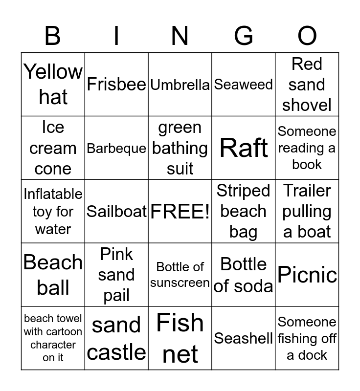 This bingo card has a free space and 24 words: Pink sand pail, sand castle, green bathing suit, beach towel with cartoon character on it, Red sand shovel, Yellow hat, Ice cream cone, Frisbee, Striped beach bag, Bottle of sunscreen, Raft, Inflatable toy for water, Bottle of soda, Picnic, Barbeque, Seashell, Trailer pulling a boat, Umbrella, Someone reading a book, Sailboat, Someone fishing off a dock, Beach ball, Seaweed and Fish net.
