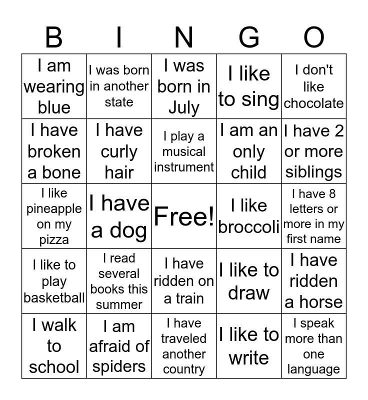 This bingo card has a free space and 24 words: I walk to school, I read several books this summer, I play a musical instrument, I like to write, I don't like chocolate, I am wearing blue, I was born in another state, I was born in July, I like broccoli, I have 8 letters or more in my first name, I like pineapple on my pizza, I have curly hair, I like to draw, I have ridden a horse, I have broken a bone, I am afraid of spiders, I have traveled another country, I like to sing, I have 2 or more siblings, I like to play basketball, I have a dog, I have ridden on a train, I am an only child and I speak more than one language.