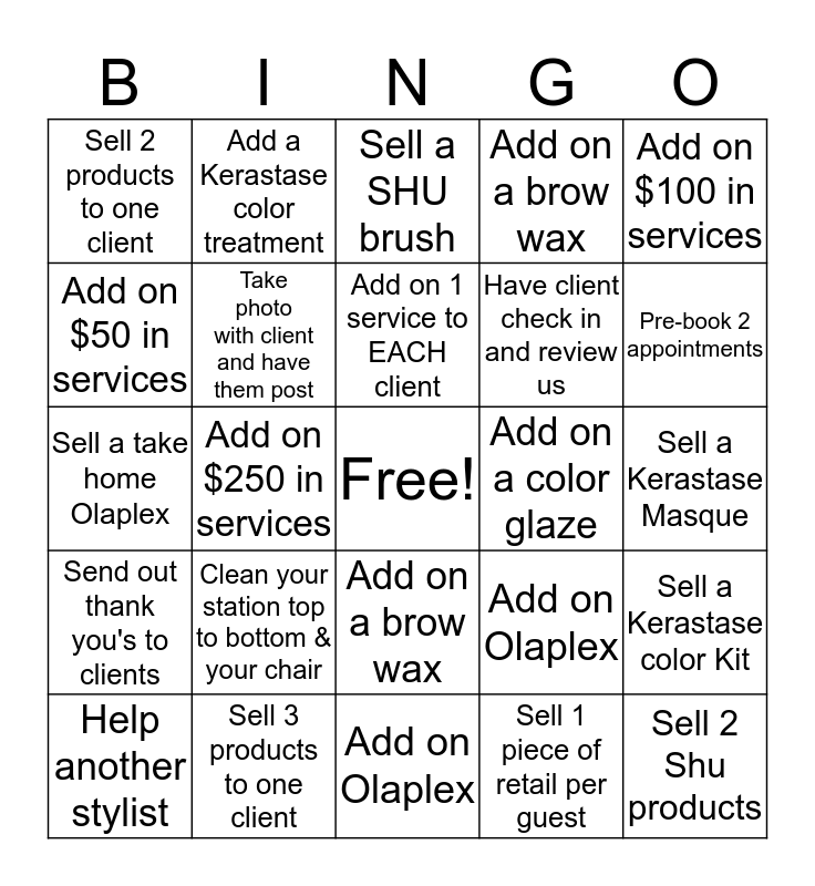 This bingo card has a free space and 24 words: Clean your station top to bottom & your chair, Sell 3 products to one client, Add on 1 service to EACH client, Help another stylist, Add on $100 in services, Sell 2 products to one client, Add on $50 in services, Add a Kerastase color treatment, Add on a color glaze, Add on a brow wax, Have client check in and review us, Sell a take home Olaplex, Add on Olaplex, Sell a Kerastase color Kit, Take photo with client and have them post, Sell 1 piece of retail per guest, Sell a Kerastase Masque, Sell a SHU brush, Pre-book 2 appointments, Add on $250 in services, Sell 2 Shu products, Send out thank you's to clients, Add on a brow wax and Add on Olaplex.