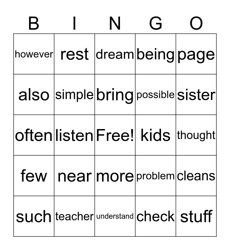 This bingo card has a free space and 35 words: yourself, answer, money, simple, more, being, also, slowly, bring, hear, often, page, store, while, however, kids, check, listen, few, stuff, problem, such, cleans, teacher, dream, sister, plan, they're, possible, thought, really, understand, near, rest and soon.