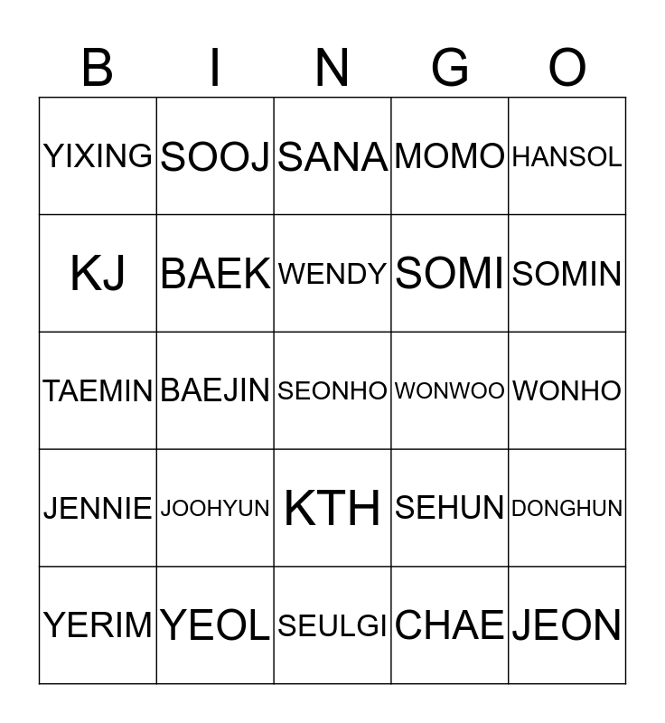 This bingo card has 25 words: JOOHYUN, SEULGI, WENDY, YERIM, HANSOL, YIXING, KJ, SOOJ, WONWOO, KTH, SOMI, TAEMIN, SEHUN, DONGHUN, BAEK, JEON, WONHO, SANA, SOMIN, BAEJIN, SEONHO, YEOL, JENNIE, MOMO and CHAE.