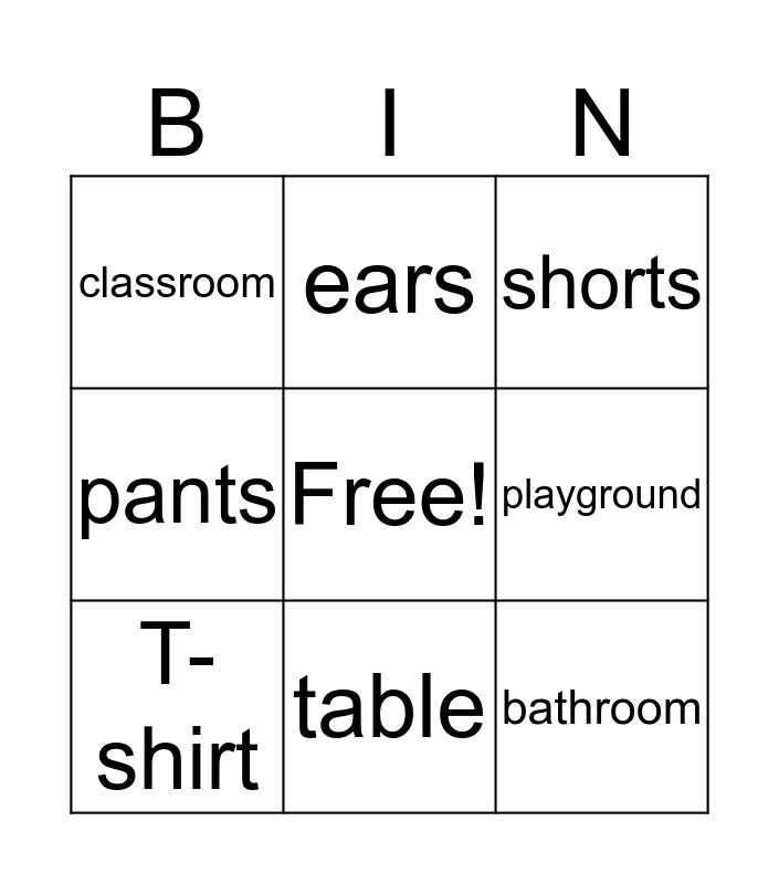 This bingo card has a free space and 23 words: book, chair, table, crayon, bathroom, classroom, playground, ears, eyes, mouth, nose, arms, feet, hands, legs, raincoat, shorts, sweater, T-shirt, boots, pants, shoes and socks.