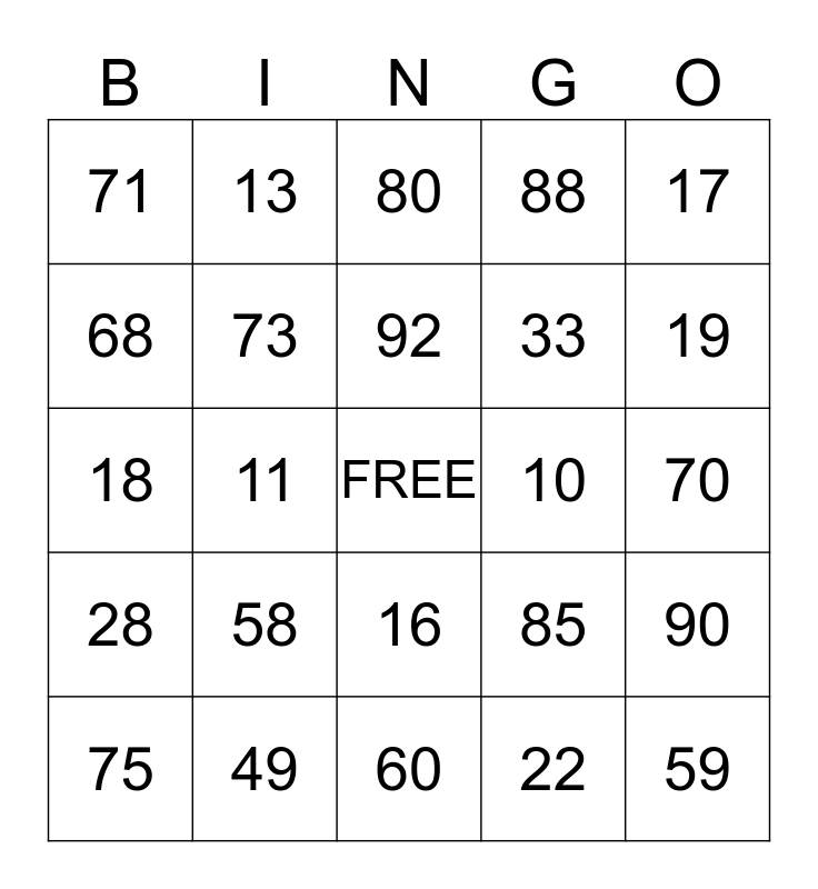 This bingo card has a free space and 24 words: 58, 49, 92, 75, 17, 71, 68, 13, 10, 16, 33, 18, 85, 90, 73, 22, 70, 80, 19, 11, 59, 28, 88 and 60.