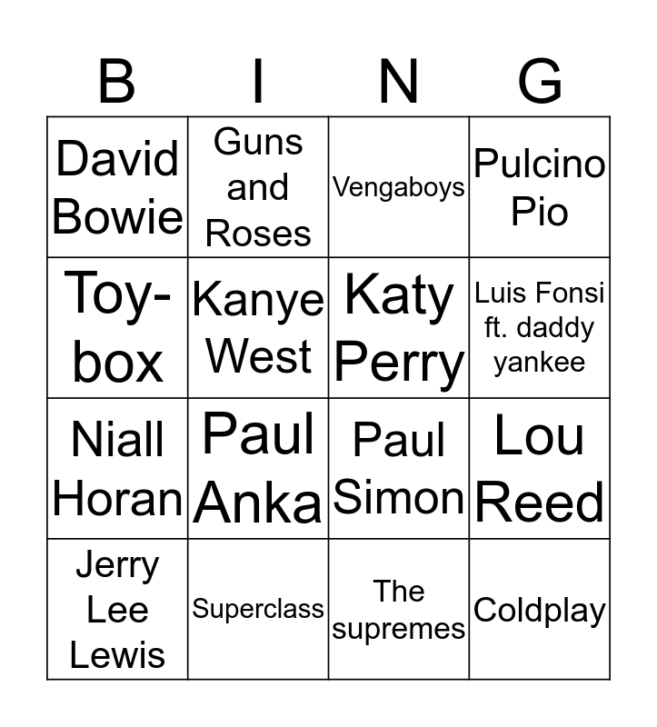 This bingo card has 44 words: Free!, Jerry Lee Lewis, The Partysquad, Lawineboys, Schurzenjager, Guus Meeuwis, Vengaboys, Aqua, Toy-box, Chipz, Pulcino Pio, Superclass, Huub Hangop, Kinderen voor kinderen, Prince, The Police, Pink Floyd, Paul Simon, ACDC, Paul Anka, Guns and Roses, Frank Boeijen, Led Zeppelin, David Bowie, Metallica, The supremes, Pearl Jam, Dire straits, Toto, Coldplay, Fleetwood Mac, U2, The Rolling Stones, Eric clapton, Lou Reed, Dolly Parton, Ed Sheeran, Stromae, Luis Fonsi ft. daddy yankee, Kanye West, Niall Horan, Imagine Dragons, Katy Perry and the Chainsmokers.