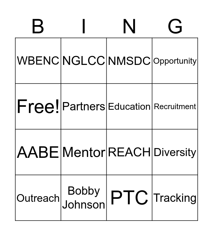 This bingo card has 16 words: Bobby Johnson, Diversity, NMSDC, WBENC, AABE, NGLCC, REACH, PTC, Free!, Partners, Outreach, Opportunity, Mentor, Recruitment, Education and Tracking.