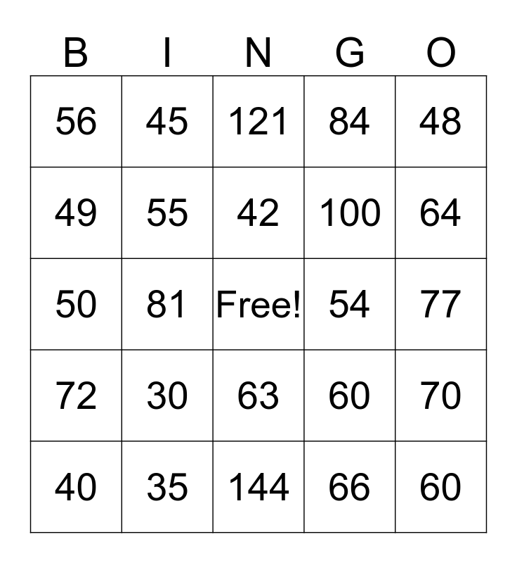 This bingo card has a free space and 24 words: 30, 35, 42, 40, 48, 56, 49, 45, 54, 63, 100, 50, 60, 70, 55, 66, 77, 121, 64, 81, 60, 72, 84 and 144.