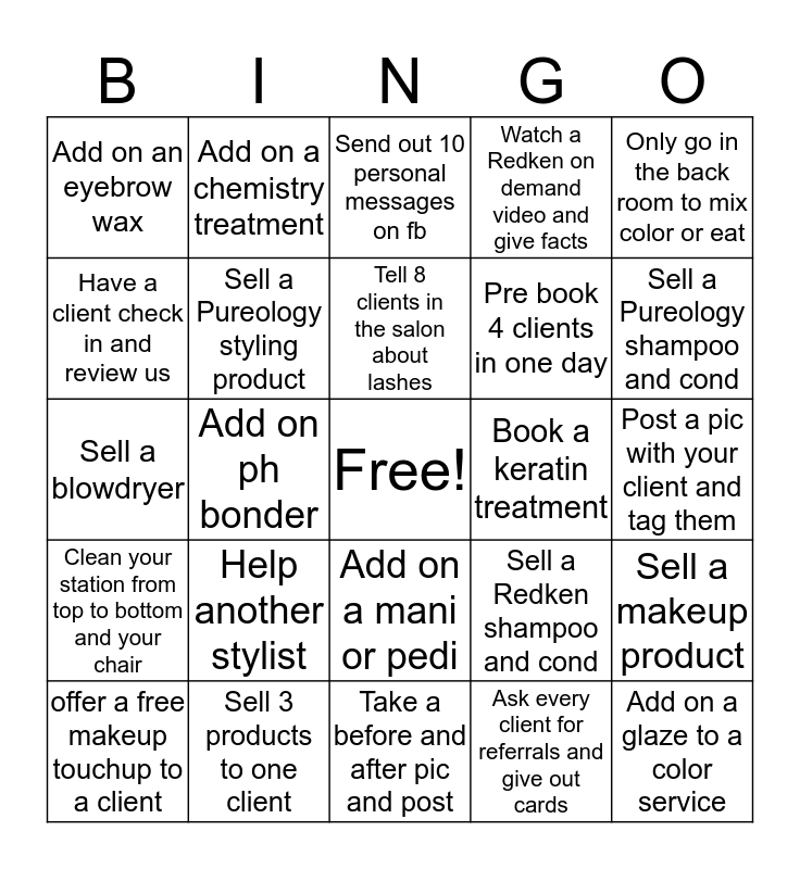 This bingo card has a free space and 24 words: Help another stylist, Sell 3 products to one client, Tell 8 clients in the salon about lashes, offer a free makeup touchup to a client, Only go in the back room to mix color or eat, Add on an eyebrow wax, Have a client check in and review us, Add on a chemistry treatment, Book a keratin treatment, Add on a mani or pedi, Pre book 4 clients in one day, Sell a blowdryer, Sell a Redken shampoo and cond, Sell a makeup product, Sell a Pureology styling product, Ask every client for referrals and give out cards, Post a pic with your client and tag them, Send out 10 personal messages on fb, Sell a Pureology shampoo and cond, Add on ph bonder, Add on a glaze to a color service, Clean your station from top to bottom and your chair, Watch a Redken on demand video and give facts and Take a before and after pic and post.