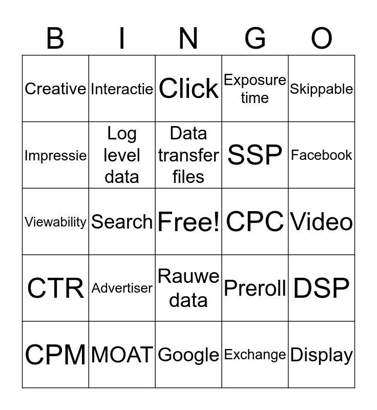 This bingo card has a free space and 28 words: DSP, DMP, SSP, Exchange, Impressie, Click, Interactie, CTR, CPC, CPM, Viewability, Exposure time, MOAT, Google, Facebook, Publisher, Advertiser, Log level data, Data transfer files, Rauwe data, Creative, Content, Display, Search, Video, Preroll, Skippable and YouTube.