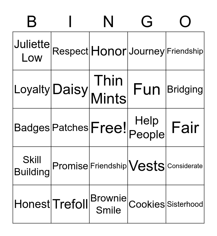 This bingo card has a free space and 24 words: Promise, Trefoll, Thin Mints, Honest, Friendship, Juliette Low, Loyalty, Respect, Help People, Friendship, Fun, Badges, Vests, Considerate, Daisy, Cookies, Fair, Honor, Bridging, Patches, Sisterhood, Skill Building, Journey and Brownie Smile.