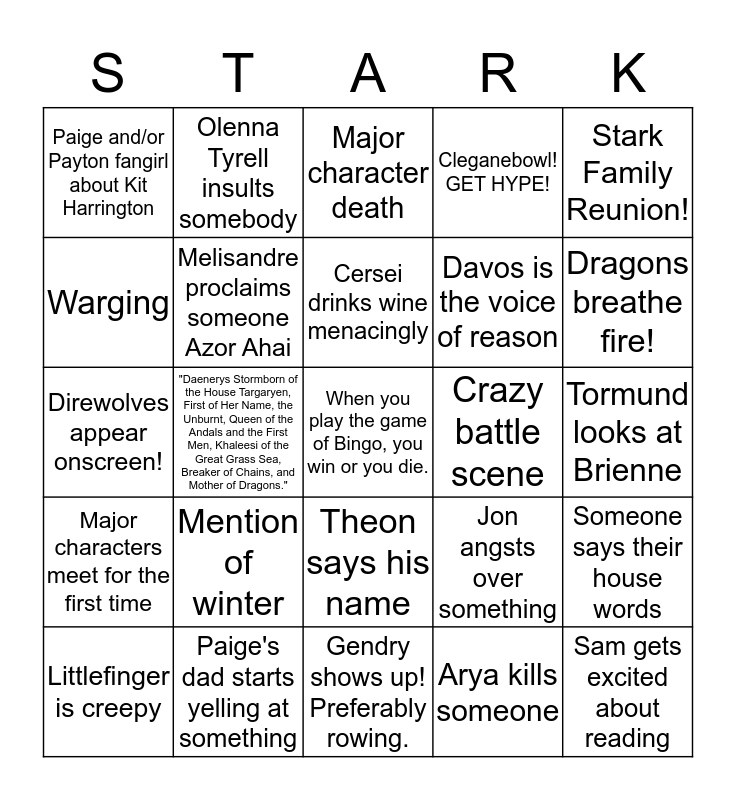 This bingo card has a free space and 24 words: Mention of winter, Paige's dad starts yelling at something, Cersei drinks wine menacingly, Littlefinger is creepy, Stark Family Reunion!, Paige and/or Payton fangirl about Kit Harrington, Warging, Olenna Tyrell insults somebody, Crazy battle scene, Theon says his name, Davos is the voice of reason, Direwolves appear onscreen!, Jon angsts over something, Someone says their house words, Melisandre proclaims someone Azor Ahai, Arya kills someone, Tormund looks at Brienne, Major character death, Dragons breathe fire!, "Daenerys Stormborn of the House Targaryen, First of Her Name, the Unburnt, Queen of the Andals and the First Men, Khaleesi of the Great Grass Sea, Breaker of Chains, and Mother of Dragons.", Sam gets excited about reading, Major characters meet for the first time, Cleganebowl! GET HYPE! and Gendry shows up! Preferably rowing..
