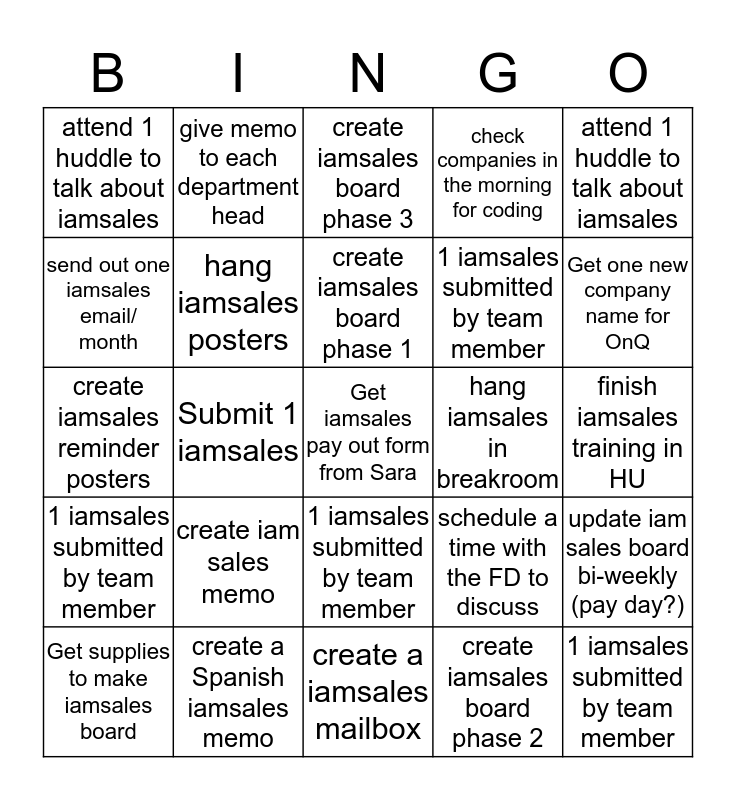 This bingo card has a free space and 24 words: Get supplies to make iamsales board, create iam sales memo, create iamsales board phase 1, create iamsales board phase 2, attend 1 huddle to talk about iamsales, attend 1 huddle to talk about iamsales, give memo to each department head, create iamsales board phase 3, hang iamsales in breakroom, finish iamsales training in HU, create iamsales reminder posters, hang iamsales posters, schedule a time with the FD to discuss, update iam sales board bi-weekly (pay day?), send out one iamsales email/ month, create a Spanish iamsales memo, create a iamsales mailbox, check companies in the morning for coding, Get one new company name for OnQ, 1 iamsales submitted by team member, Submit 1 iamsales, 1 iamsales submitted by team member, 1 iamsales submitted by team member and 1 iamsales submitted by team member.