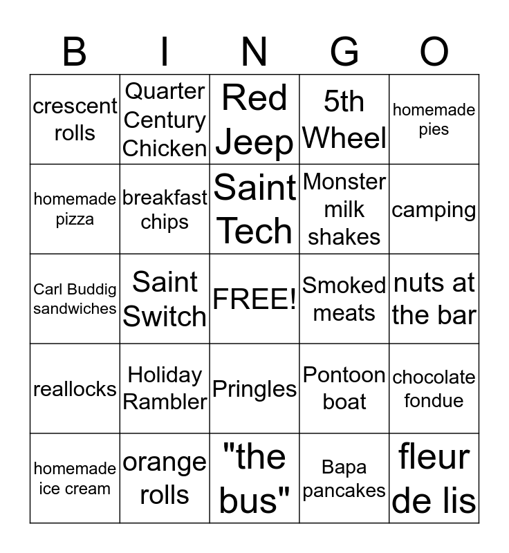 This bingo card has a free space and 24 words: Holiday Rambler, orange rolls, Saint Tech, homemade ice cream, homemade pies, crescent rolls, homemade pizza, Quarter Century Chicken, Smoked meats, Pringles, Monster milk shakes, Carl Buddig sandwiches, Pontoon boat, chocolate fondue, breakfast chips, Bapa pancakes, nuts at the bar, Red Jeep, camping, Saint Switch, fleur de lis, reallocks, 5th Wheel and "the bus".