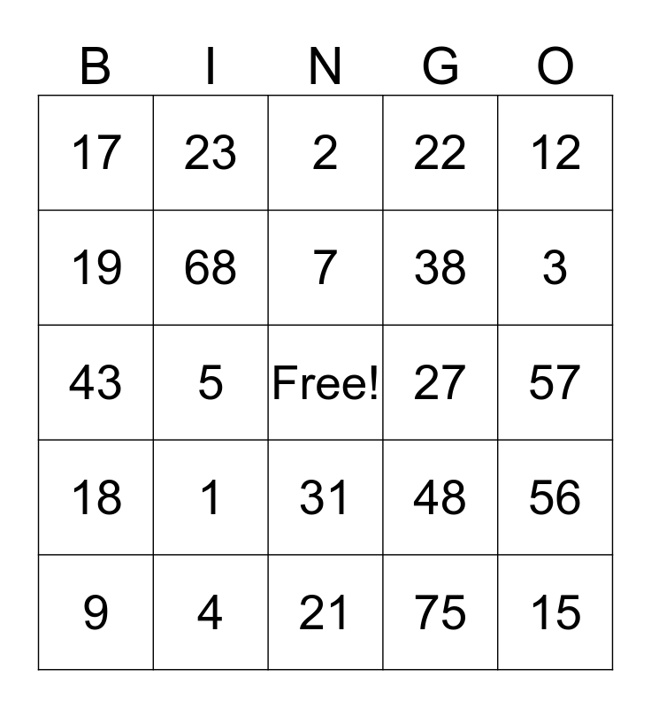 This bingo card has a free space and 24 words: 1, 4, 7, 9, 12, 17, 19, 23, 27, 31, 38, 43, 48, 56, 68, 75, 57, 2, 3, 5, 15, 18, 22 and 21.