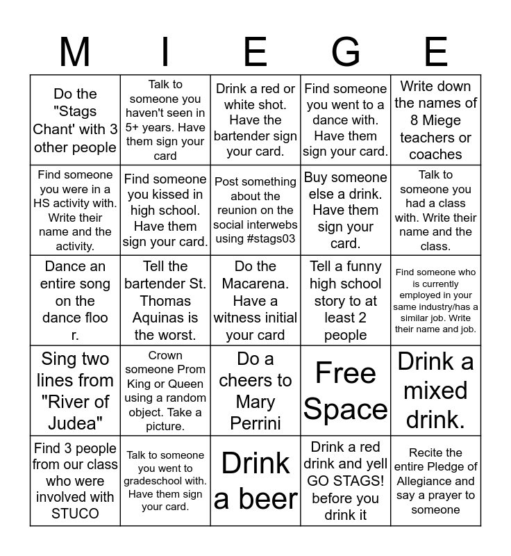 This bingo card has 25 words: Crown someone Prom King or Queen using a random object. Take a picture., Drink a beer, Post something about the reunion on the social interwebs using #stags03, Find 3 people from our class who were involved with STUCO, Write down the names of 8 Miege teachers or coaches, Do the "Stags Chant' with 3 other people, Find someone you were in a HS activity with. Write their name and the activity., Talk to someone you haven't seen in 5+ years. Have them sign your card, Tell a funny high school story to at least 2 people, Do a cheers to Mary Perrini, Buy someone else a drink. Have them sign your card., Dance an entire song on the dance floor., Free Space, Drink a mixed drink., Find someone you kissed in high school. Have them sign your card., Recite the entire Pledge of Allegiance and say a prayer to someone, Find someone who is currently employed in your same industry/has a similar job. Write their name and job., Drink a red or white shot. Have the bartender sign your card., Talk to someone you had a class with. Write their name and the class., Tell the bartender St. Thomas Aquinas is the worst., Do the Macarena. Have a witness initial your card, Talk to someone you went to gradeschool with. Have them sign your card., Sing two lines from "River of Judea", Find someone you went to a dance with. Have them sign your card. and Drink a red drink and yell GO STAGS! before you drink it.
