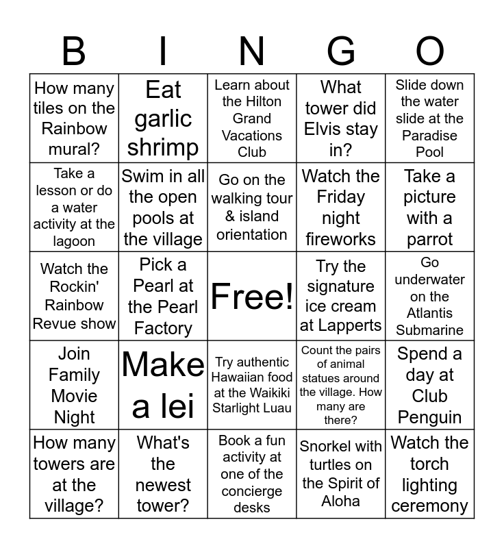 This bingo card has a free space and 24 words: Make a lei, What's the newest tower?, Go on the walking tour & island orientation, How many towers are at the village?, Slide down the water slide at the Paradise Pool, How many tiles on the Rainbow mural?, Take a lesson or do a water activity at the lagoon, Eat garlic shrimp, Try the signature ice cream at Lapperts, Try authentic Hawaiian food at the Waikiki Starlight Luau, Watch the Friday night fireworks, Watch the Rockin' Rainbow Revue show, Count the pairs of animal statues around the village. How many are there?, Spend a day at Club Penguin, Swim in all the open pools at the village, Snorkel with turtles on the Spirit of Aloha, Go underwater on the Atlantis Submarine, Learn about the Hilton Grand Vacations Club, Take a picture with a parrot, Pick a Pearl at the Pearl Factory, Watch the torch lighting ceremony, Join Family Movie Night, What tower did Elvis stay in? and Book a fun activity at one of the concierge desks.