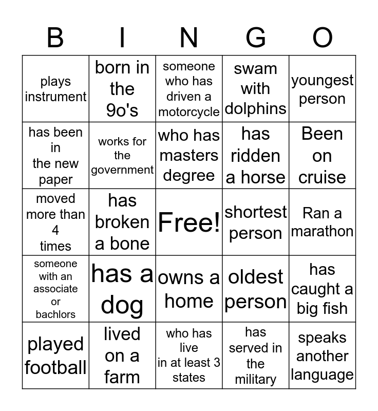 This bingo card has a free space and 24 words: has a dog, lived on a farm, who has masters degree, played football, youngest person, plays instrument, has been in the new paper, born in the 9o's, shortest person, owns a home, has ridden a horse, moved more than 4 times, oldest person, has caught a big fish, works for the government, has served in the military, Ran a marathon, someone who has driven a motorcycle, Been on cruise, has broken a bone, speaks another language, someone with an associate or bachlors, swam with dolphins and who has live in at least 3 states.