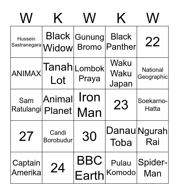 This bingo card has a free space and 24 words: Captain Amerika, Candi Borobudur, Lombok Praya, Pulau Komodo, 22, Hussein Sastranegara, Black Widow, Gunung Bromo, 23, Soekarno-Hatta, Sam Ratulangi, Tanah Lot, Danau Toba, Ngurah Rai, ANIMAX, 24, BBC Earth, Black Panther, National Geographic, 27, Animal Planet, 30, Waku Waku Japan and Spider-Man.
