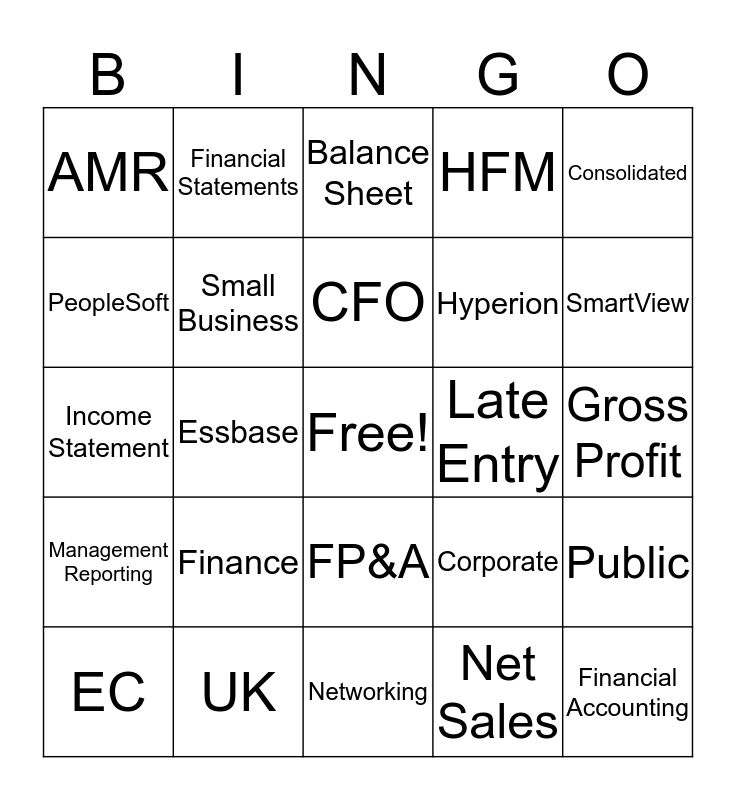 This bingo card has a free space and 24 words: Finance, UK, CFO, EC, Consolidated, AMR, PeopleSoft, Financial Statements, Late Entry, FP&A, Hyperion, Income Statement, Corporate, Public, Small Business, Net Sales, Gross Profit, Balance Sheet, SmartView, Essbase, Financial Accounting, Management Reporting, HFM and Networking.