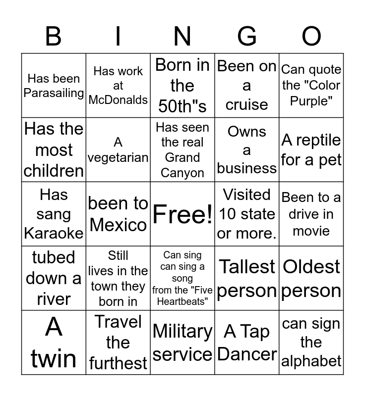 This bingo card has a free space and 24 words: A twin, Still lives in the town they born in, Has seen the real Grand Canyon, A Tap Dancer, Can quote the "Color Purple", Has been Parasailing, Has work at McDonalds, Born in the 50th"s, Visited 10 state or more., Been to a drive in movie, Has sang Karaoke, A vegetarian, Tallest person, Oldest person, Has the most children, Travel the furthest, Military service, Been on a cruise, A reptile for a pet, tubed down a river, been to Mexico, Can sing can sing a song from the "Five Heartbeats", Owns a business and can sign the alphabet.