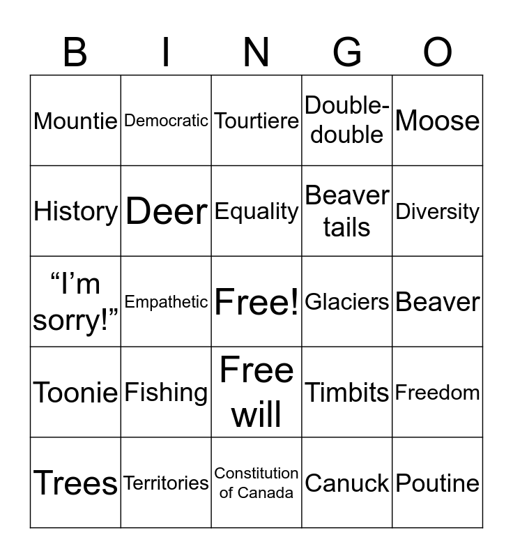 This bingo card has a free space and 65 words: Identity, Strong, Unity, Freedom, Resourceful, Safe, Democratic, Independent, Equality, Welcoming, Free will, Neighbourly/friendly, Beaver, Moose, Time Horton’s, History, Empathetic, Mountie, Maple syrup, Beaver tails, Fishing, Toonie, Double-double, Chinook, Toque, Mickey, Two-four, Parka, Poutine, Mountains, Trees, Igloo, Mukluks, Loonie, Timbits, Territories, Hockey, “I’m sorry!”, Canuck, Parliament, Deer, “Eh”, Glaciers, Prime Minister, Toboggan, House of Commons, Diversity, Snow, Senate, True North Strong, Nanaimo Bar, Maple Leaf, First Nations, Constitution of Canada, We stand on guard for thee, Shovel, Bacon, Tourtiere, Hydro, Pencil crayon, Peameal, Butter tarts, Hunting, Multicultural and Peaceful.
