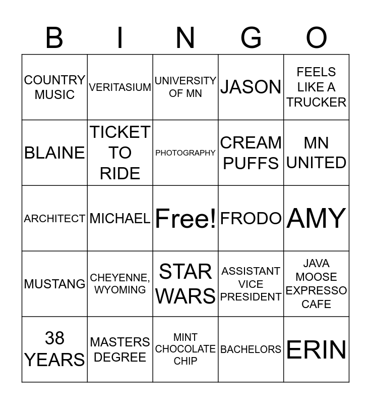 This bingo card has a free space and 39 words: SOUND BOARD, WHIST, VIETZKE, TICKET TO RIDE, 38 YEARS, STAR WARS, PHOTOGRAPHY, NORTH SHORE, FEELS LIKE A TRUCKER, MUSTANG, MICHAEL, JASON, ERIN, AMY, FRODO, CHEYENNE, WYOMING, BLUE, COUNTRY MUSIC, CHRISTIAN MUSIC, ASSISTANT VICE PRESIDENT, BLAINE, MINT CHOCOLATE CHIP, CREAM PUFFS, MN UNITED, CRISIS LINE, 100 GRAND, BOXCARS, CHESS, VOLUNTEERING, VERITASIUM, MUSHROOM & PEPPERONI, BUSINESS & ECONOMICS DEGREE, UNIVERSITY OF MN, MASTERS DEGREE, BACHELORS, BUSINESS ADMINISTARTION, JAVA MOOSE EXPRESSO CAFE, ARCHITECT and VOLUNTEERS.