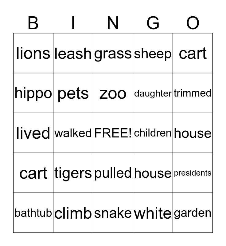 This bingo card has a free space and 24 words: tigers, climb, zoo, bathtub, cart, lions, hippo, leash, children, pulled, daughter, lived, house, presidents, pets, white, house, grass, trimmed, walked, garden, cart, sheep and snake.