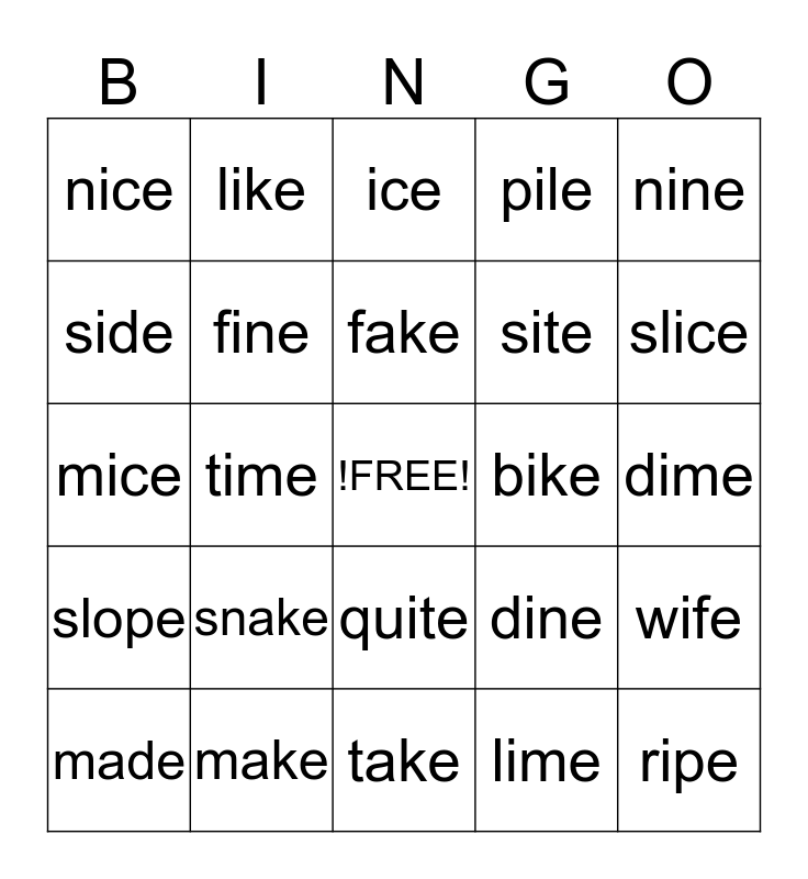 This bingo card has a free space and 24 words: snake, make, fake, made, nine, nice, side, like, bike, quite, site, mice, dine, wife, fine, lime, dime, ice, slice, time, ripe, slope, pile and take.