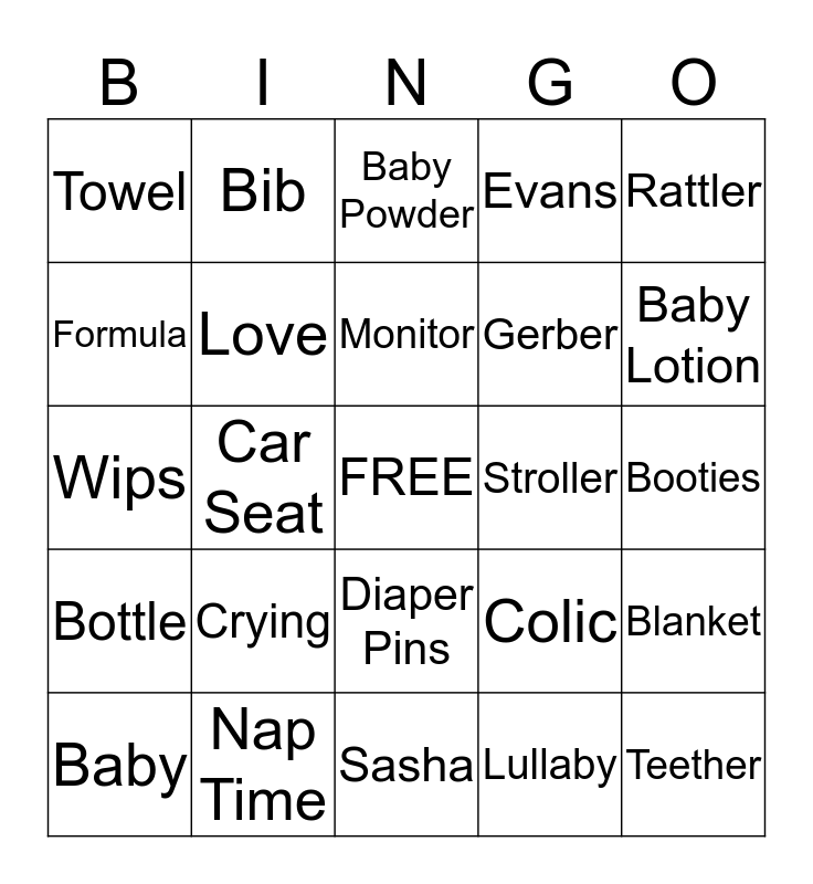 This bingo card has a free space and 24 words: Crying, Nap Time, Monitor, Baby, Rattler, Towel, Formula, Bib, Stroller, Diaper Pins, Gerber, Wips, Colic, Blanket, Love, Lullaby, Booties, Baby Powder, Baby Lotion, Car Seat, Teether, Bottle, Evans and Sasha.